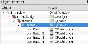 - Add a push button to the second frame,set its minimumSize and maximum Size to Width 120,Height 101, now copy and past 3 more of these buttons.