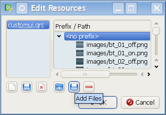 Now Create a new resource file called customui.rc, add a blank prefix and then add all the images from our image directory using the add files icon. Save this.