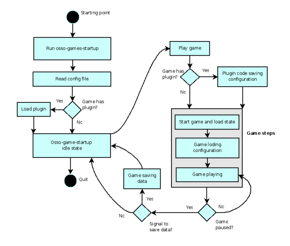 To execute the game, the osso-games-startup application needs to be called. The game configuration file must be passed as an argument. Once loaded, osso-games-startup creates a common interface for all games and, if needed, loads a specific plug-in for each game. Games are activated through an auto-activating D-Bus message, which tells the game either to start, restart or to continue. In cases where no clean-up routine within the plug-in exists, it can also start the game to clean its state data. In these cases, the game usually does not open its own window, but kills the state data in the background instead.