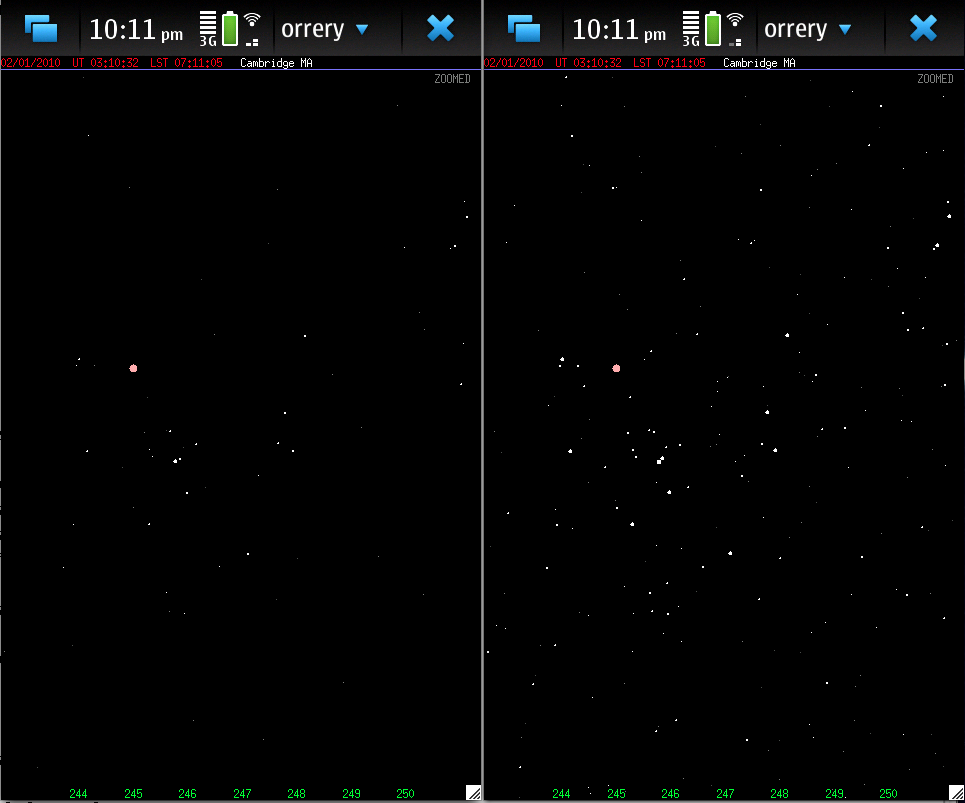 Comparison of orrery display with two different magnitude limits.