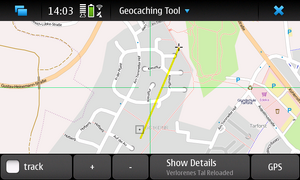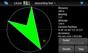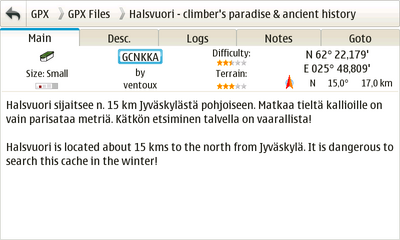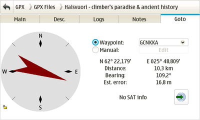 - When GPS shows your position it's time to go as close as possible to cache location. You can use both Maemo Mapper and GPXView to get there. In GPXView select Goto tab.