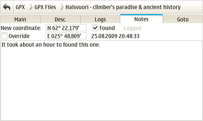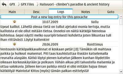 If you are connected to internet you can log your find directly from Maemo device. Just go to Logs tab and press Post a new log entry for this geocache. This opens a web browser and you can write you log entry.