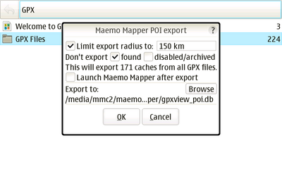 When you have some caches in your GPXView main screen you can export location of those caches to the Maemo Mapper as a POI data. This makes it easier to get general overview of the cache area. To export caches as Maemo Mapper POI select Export -> Maemo Mapper POI from the GPXViews menu.