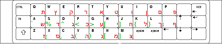 In Hebrew mode, the keyboard map is: