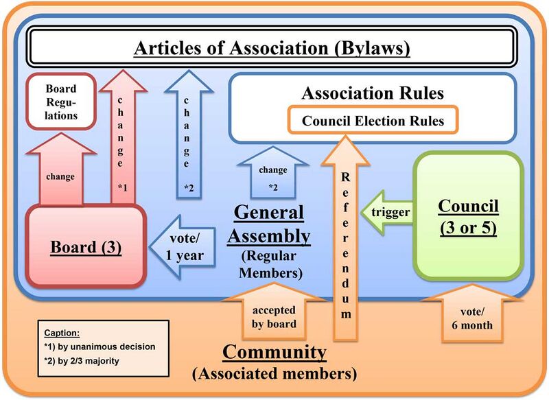 All statements are given fact by the organizations’ bylaws as well as german and EU laws as of today (2015-04-24). According to german law, the General Assembly is the highest jurisdiction in an e.V. (eingetragener Verein) which has to follow certain criteria in its’ procedures that also need to be reflected by the meeting minutes in order to be accepted by court. According to our Bylaws, member meetings are to be held at least once per year and Council is supposed to show responsible for all elections incl. Board.