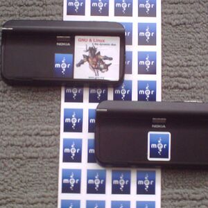 Badges are 3.18cm by 2.5cm (1.25 inch by 1 inch) with the Mer logo as seen on the desktop background, with that same blue gradient background. They fit nicely on the back of any Nokia Internet Tablet or on any laptop or desktop computer. Stylish way to let everyone know your tablet computer is Maemo Reloaded! The material is vinyl so badges should not fade or tear, like paper ones.