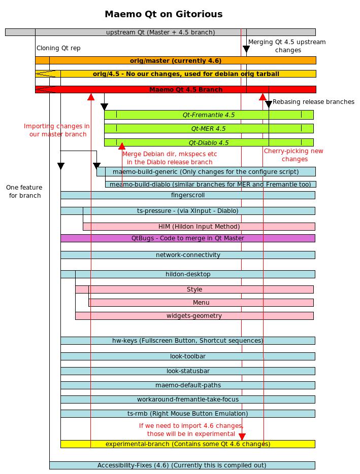 These branches has been created just to store the changes. We don't need to merge the changes from the 4.5 branch here if is not strictly needed. Don't merging upstream changes in these branches make more visible the Maemo changes. Then The 4.5 branch WON'T be merged into them to keep them up-to-date. The branch will be there and updated with our changes also when the feature is adopted upstream. Usually is hard to track dependencies between branches. The Diagram below should explain these dependencies.