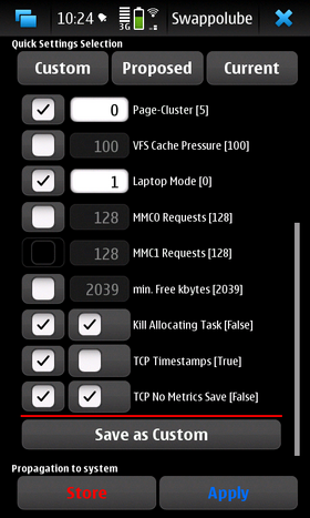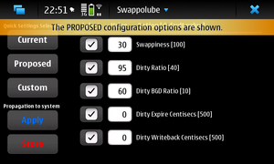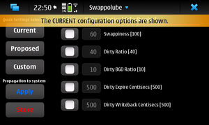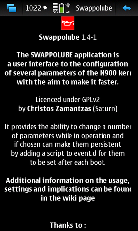 The SWAPPOLUBE is a user interface to the configuration of several parameters of the N900 kernel with the aim to make it faster.